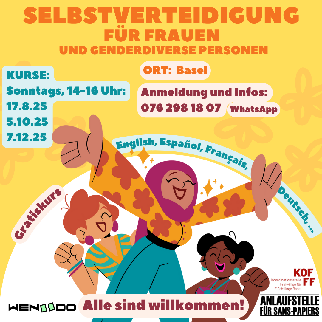 Alle zwei Monate findet ein kostenloser Wen-Do-Kurs für Sans-Papier und geflüchtete Personen ab 16 Jahren statt. Nächste Termine: 17.08 und 05.10.2025. Bei Interesse und für weitere Informationen zu Kursort und Daten könnte ihr euch per Mail oder per Telefon melden. Der aktuelle Flyer ist hier zu finden.